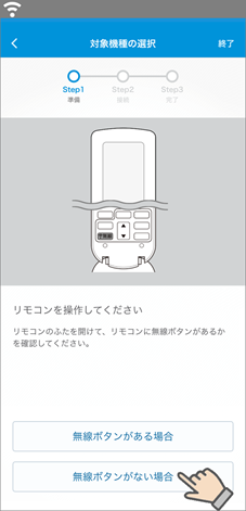 エアコンの「運転ランプ」と「タイマーランプ」が同時点滅または「タイマーランプ」のみ点滅すればアプリの[次へ]をタップします。