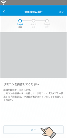 エアコンの「運転ランプ」と「タイマーランプ」が同時点滅または「タイマーランプ」のみ点滅すればアプリの[次へ]をタップします。