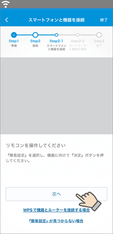 リモコンに「簡易設定」が表示したらアプリの[次へ]をタップします。