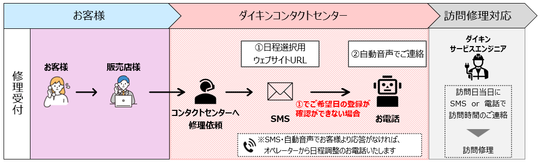 販売店経由で修理のご依頼をいただいた場合、ご訪問のお日にちについて以下の順序で対応いたします。①お客様の携帯電話に、日程調整用のURLをSMS(ショートメール)でお送りします。