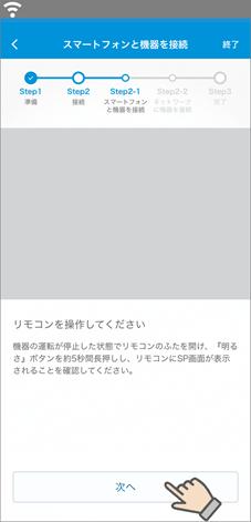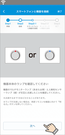 エアコンのマルチモニタランプ(赤または青)と人検知センサーランプ(緑)が交互に点滅すればアプリの[次へ]をタップします。