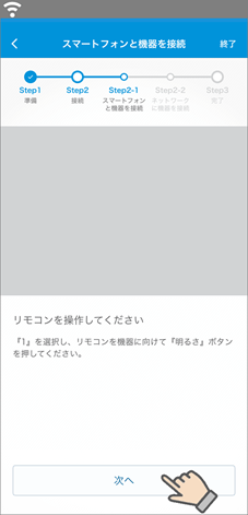 「1」が表示していることを確認し、エアコンに向けて[明るさ]ボタンを押します。