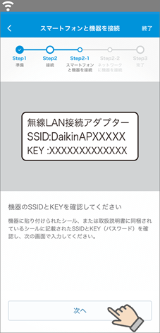 機器のSSIDとKEYを確認して[次へ]をタップします。