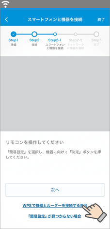 リモコンに「簡易設定」が表示したらアプリの[次へ]をタップします。