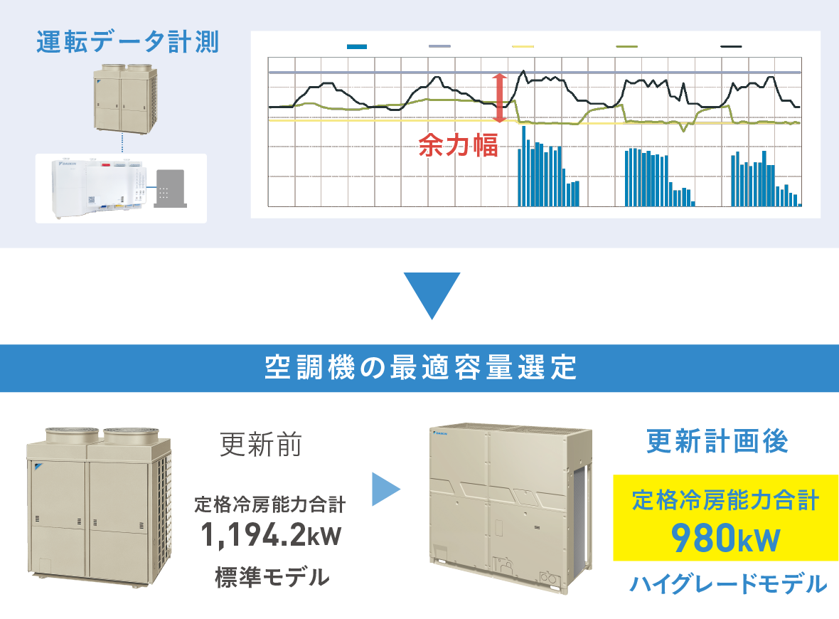 ZEB化にあたっては、LED化済みの照明に続き、空調が課題でした。 夏場の空調電力データを分析し、余力幅を可視化することにより、最適な能力に見直すことができました。