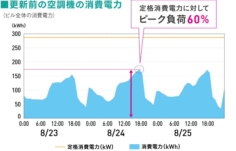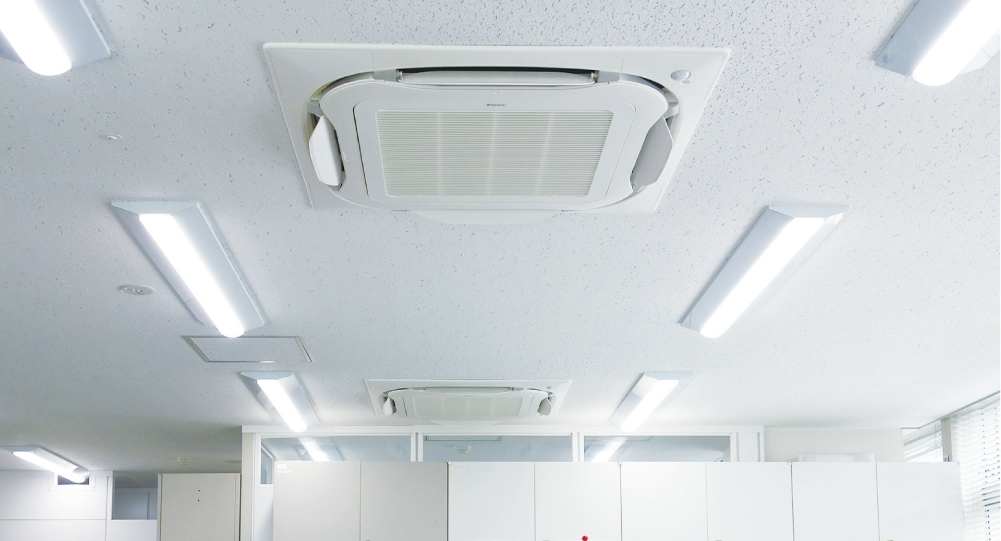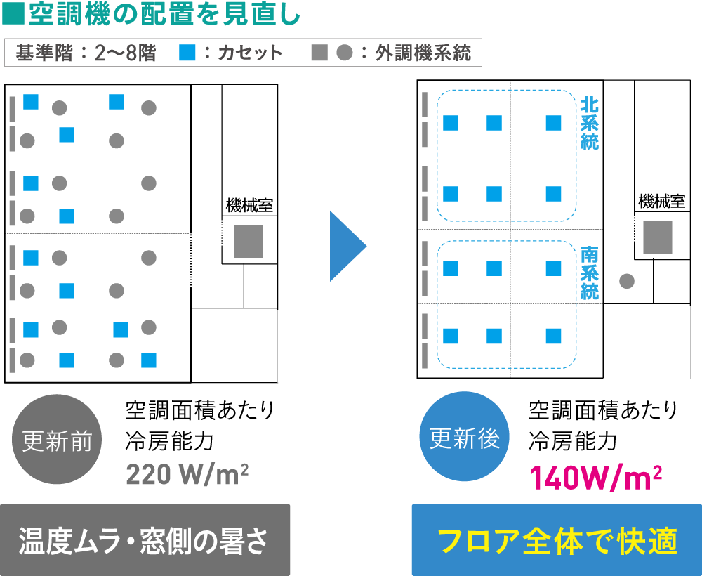 まず省エネ診断で空調機の消費電力を測定したところ、定格消費電力の60%の電力しか使用されておらず、容量に大幅な余裕があったことが判明。また、空調機の更新・増設を重ねたことで、室内機が無駄の多い配置となり、室内に温度ムラが発生していることがわかりました。