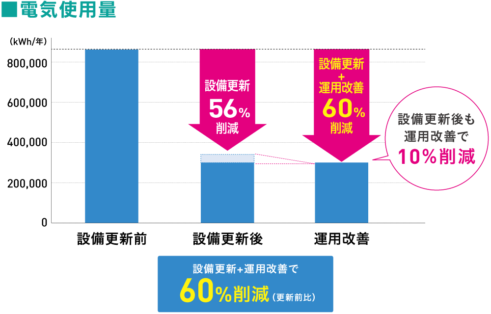 さらに、改修工事と同時に、EneFocus αを採用し、集中制御・遠隔監視の装置を導入。遠隔監視で蓄積した空調機の運転データをもとに、使用状況を見える化し、性能検証を行いました。現在も遠隔監視データによる運用改善で省エネ取組みを継続中であり、電力使用量10%の削減を達成しています。